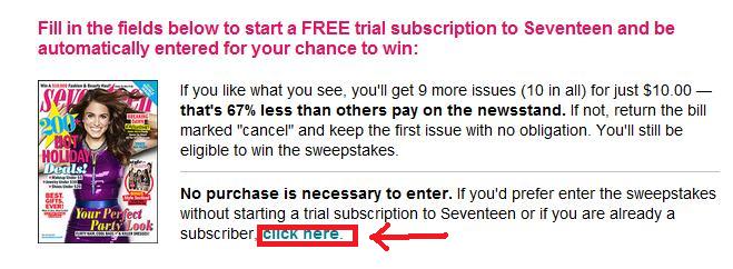 - Look for the paragraph like the picture in step 3 where it says “If you’d prefer enter the sweepstakes without starting a trial subscription….”